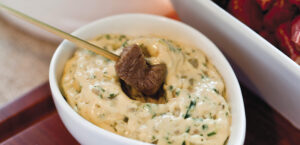 Diversos molhos podem acompanhar o fondue salgado, desde o clássico de queijo até o tártaro, mais ácido, que ajuda a equilibrar os sabores marcantes da carne.