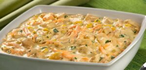 O fricassé de frango é um prato que combina cremosidade e crocância na medida certa. O creme, preparado no liquidificador com milho, requeijão e creme de leite, envolve o frango desfiado, formando uma combinação irresistível.