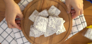 Leve à geladeira por 2 horas, corte em quadradinhos de 3 cm e passe-os pelo açúcar.
