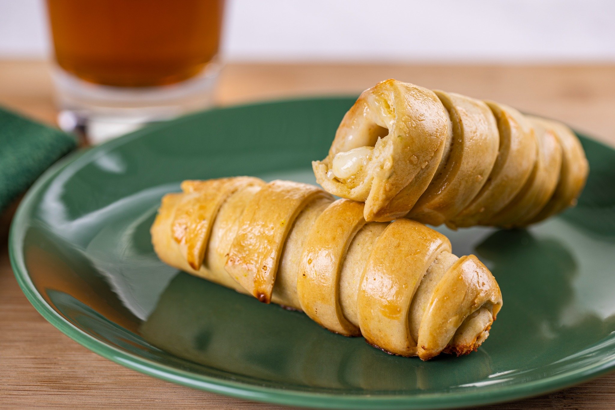 Divida a massa em 12 porções iguais e modele esferas. Com o auxílio de um rolo, abra formando círculos, até a espessura de 0,5 cm, e distribua a mistura de queijo no centro delas. Com o auxílio de uma faca, faça pequenos cortes nas laterais da massa, sem cortar o recheio. Em seguida, enrole como um rocambole, mantendo os cortes voltados para cima. Disponha em uma assadeira grande, untada, deixando espaço entre eles, cubra com um pano de prato limpo e deixe descansar por mais 20 minutos, ou até dobrar de tamanho.