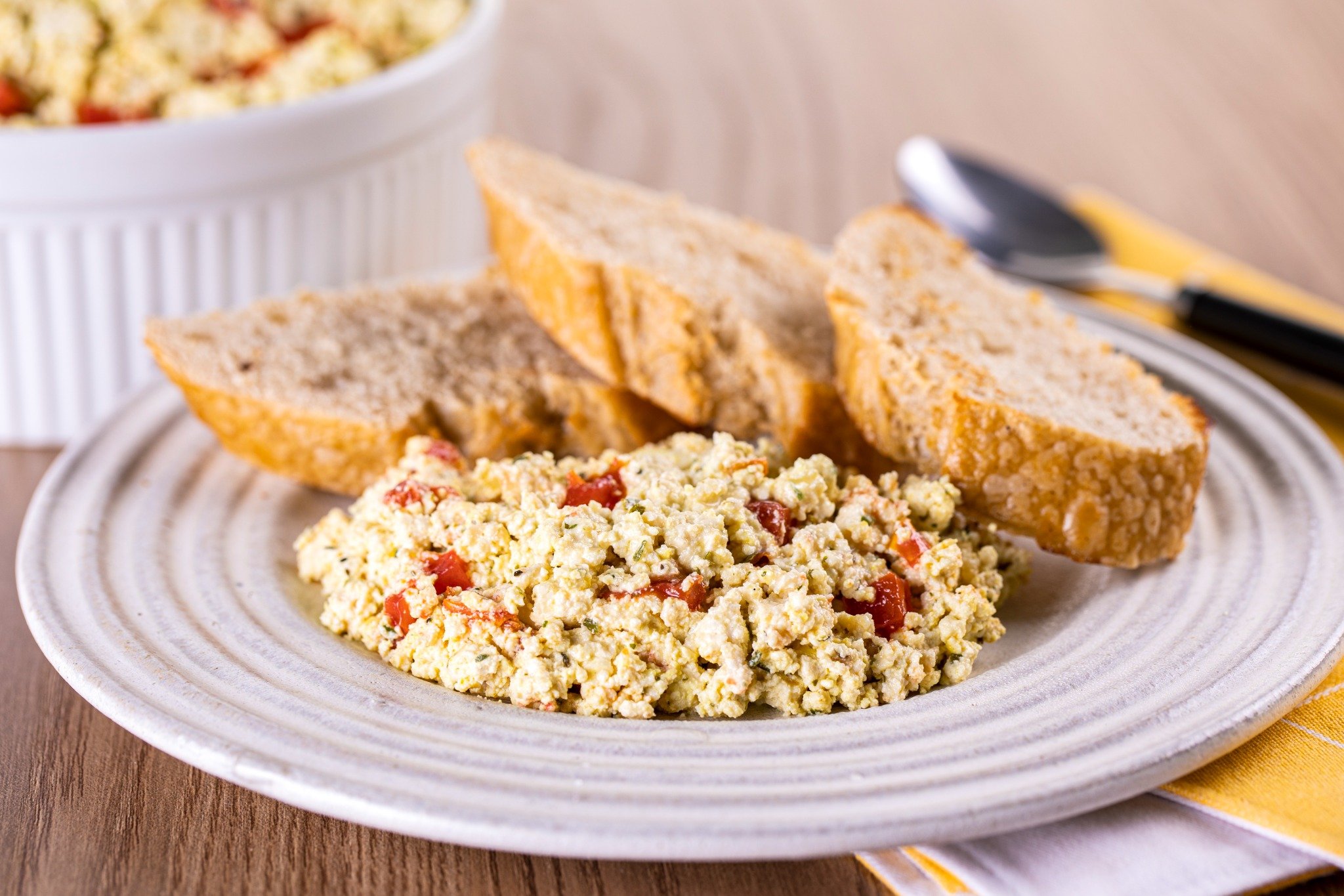- Em uma tigela pequena, coloque meia xícara (chá) do tofu e metade do Azeite TERRANO®, e amasse com auxílio de um garfo, até obter uma mistura homogênea. Reserve.
